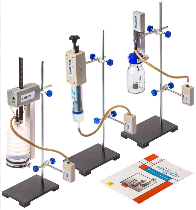 В состав набора входят три установки для осуществления изотермического, изобарного и изохорного процессов, которые имеют встроенные датчики объема и температуры, позволяющие регистрировать параметры газа в процессе изменения его состояния. Конструкция установок обеспечивает постоянство одного из параметров газа при варьировании двух других параметров. Для измерения давления газа применяется датчик абсолютного давления.