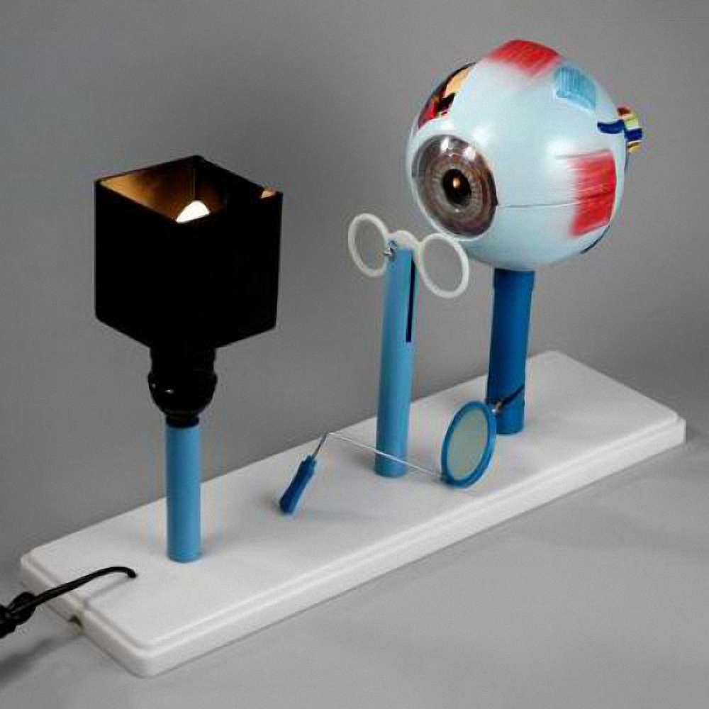 Прибор имеет основание, на котором с помощью трех стоек закреплены его основные части: модель глаза, модель очков и осветитель. В комплект прибора входит полупрозрачный экран. Модель глаза включает внешнюю оболочку глаза – склеру, роговую оболочку, радужную оболочку, хрусталик и стекловидное тело. Модель является разборной. Склера состоит из трех разделяющихся частей: нижней, верхней и задней. Нижняя часть склеры жестко закреплена на стойке. Верхняя и задняя части могут отделяться от нижней, после чего от модели глаза могут быть поочередно отделены роговая и радужная оболочки и станут доступными для визуального наблюдения хрусталик и стекловидное тело. На внутренних и внешних поверхностях частей склеры нанесено цветное изображение зрительных нервов и мышц глаза. Стойка модели глаза может поворачиваться относительно основания прибора. Хрусталик изготовлен в виде полости с эластичными прозрачными стенками. Внутри полости находится глицерин. Полость хрусталика соединена патрубком и гибкой трубкой с узлом, с помощью которого может изменяться давление глицерина на стенки полости. При этом изменяется кривизна поверхности хрусталика, что имитирует аккомодацию глаза при рассматривании какого-то предмета. Узел изменения давления находится внутри стойки, на которой модель глаза прикреплена к основанию прибора. Ручка для регулировки давления выступает из наклонного паза в нижней части поверхности стойки. При перемещении ручки вверх по пазу давление глицерина возрастает, и кривизна поверхности хрусталика увеличивается. Стекловидное тело имеет отверстия в передней и задней части. В переднем отверстии закреплен хрусталик. Заднее отверстие закрывает полупрозрачный экран, который с помощью петли шарнирно соединен со стекловидным телом. На экран проецируется изображение предмета, создаваемого хрусталиком. Модель очков представляет собой пластмассовый диск с тремя круглыми лунками, закрепленный на подвижной стойке непосредственно перед роговой оболочкой модели глаза. В лунки вставлены собирающая и рассеивающая линзы и обычное стекло (для сравнения результатов исследований). Модель очков прикреплена к стойке так, что может вращаться вокруг горизонтальной оси. Осветитель представляет собой электропатрон специальной формы, в который ввинчена матовая лампа накаливания. Патрон жестко закреплен внутри непрозрачного кожуха, предотвращающего попадание яркого света от лампы в глаза. Стенка кожуха, обращенная к модели глаза, имеет отверстие в виде стрелки и может отделяться от осветителя. В нижней части патрона находится кнопка включения лампы. Кожух с лампой надевается на подвижную стойку модели. Полупрозрачный экран представляет собой тонкий диск, изготовленный из прозрачного пластика, одна из поверхностей которого сделана матовой. Диск вставлен в оправу. Оправа имеет фигурную ручку. Экран используют для наблюдения изображения, даваемого хрусталиком при демонстрации дефектов зрения.