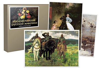 Пособие представляет собой набор репродукций картин русских художников, изготовленных на плотной небликующей бумаге, предназначенный для уроков МХК, изобразительного искусства или занятий по развитию речи в рамках уроков русского языка. В состав пособия включены репродукции картин художников: И.К. Айвазовского, К.П. Брюллова, В.М. Васнецова, М.А. Врубеля, А.А. Иванова, А.И. Куинджи, И.И. Левитана, В.Г. Перова, Н.К. Рериха, А. Рублева, А.К. Саврасова, П.А. Федотова, И.Ф. Хруцкого, И.И. Шишкина.
