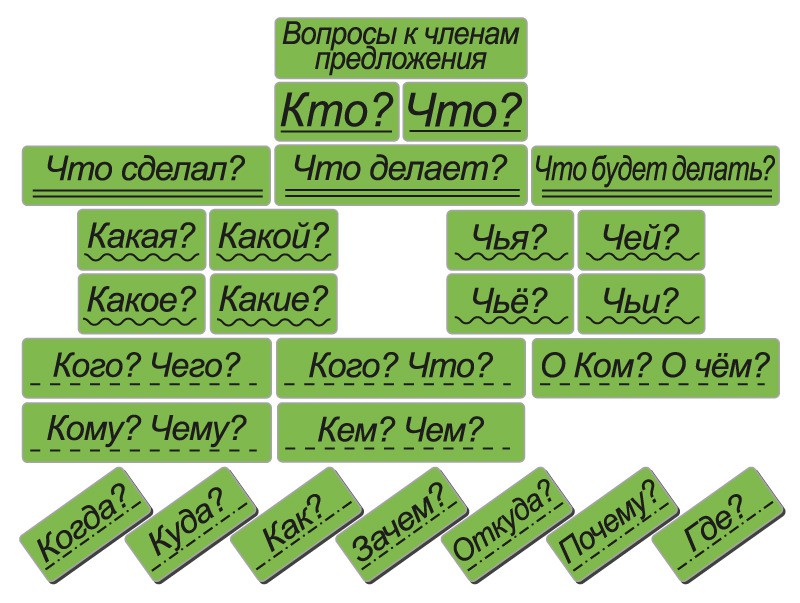 Набор магнитных карточек "Вопросы к членам предложения" (фон зелёный)