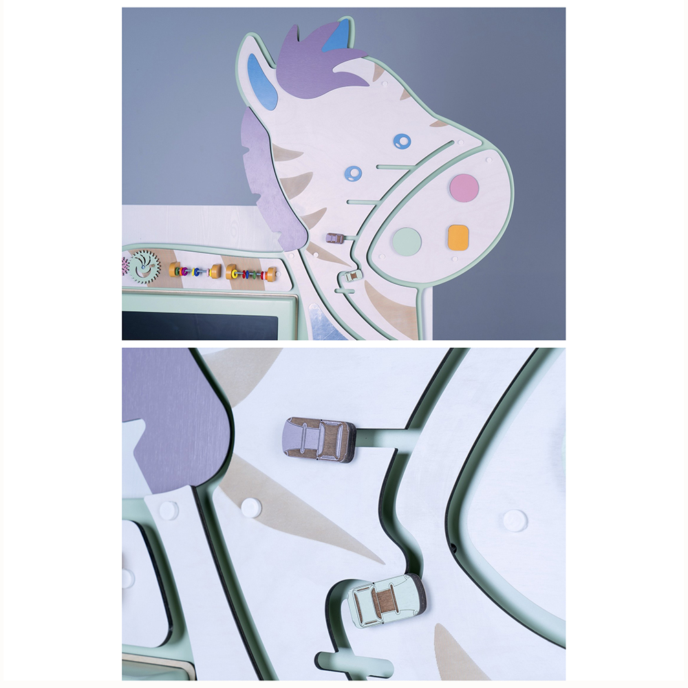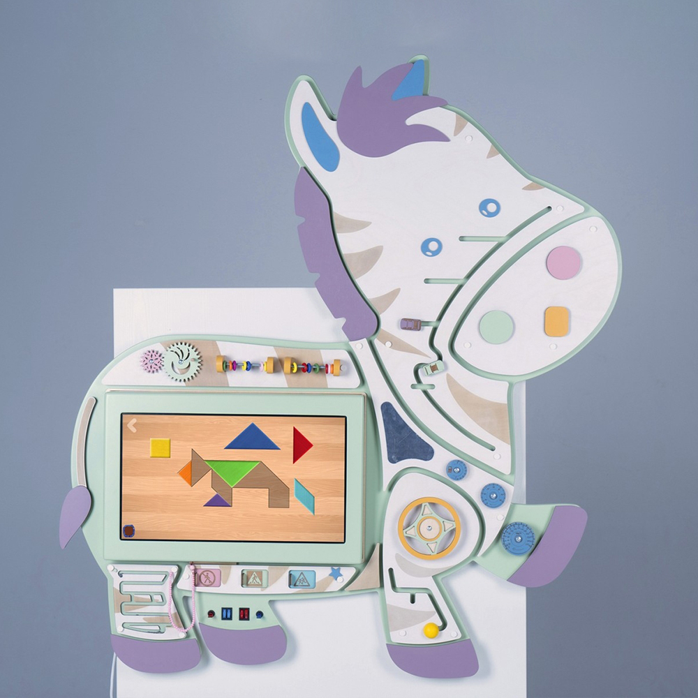 Интерактивный бизиборд «Зебруша» для детских образовательных учреждений, сочетает в себе классические сенсорные элементы Марии Монтессори и современные интерактивные технологии.