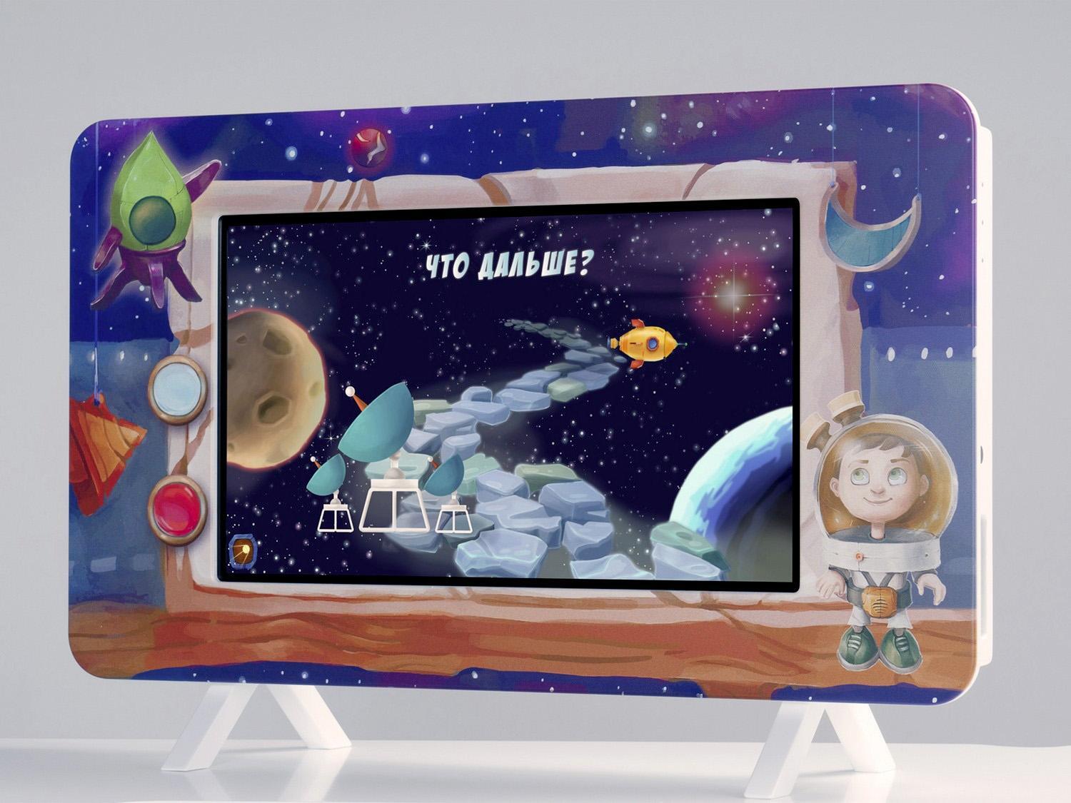 Интерактивная настенная панель оформлена в космическом стиле. Она позволяет проводить игровые занятия с детьми по всей программе дошкольной подготовки. Установленное на панель ПО «Дошкольное Образование» содержит 80 обучающих игр и 110 тестов на развитие памяти, внимания и логики, дети учатся счёту и английскому языку. Волшебная раскраска «Оживариум» стимулирует творческие способности малышей, а интерактивный квест «5 Островов» закрепляет навыки, нужные для успешного обучения в школе.