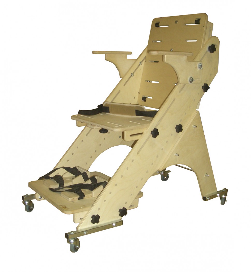 Опора для сидения предназначена для реабилитационных мероприятий с детьми с ограниченными возможностями, с патологиями различной степени тяжести, в том числе ДЦП. Представляет собой регулируемое ортопедическое кресло на металлической колесной основе. Рама опоры изготовлена из высококачественной фанеры со стойким противоаллергенным покрытием, расположена на металлической колесной основе. Колеса поворотные, все оснащены тормозами.