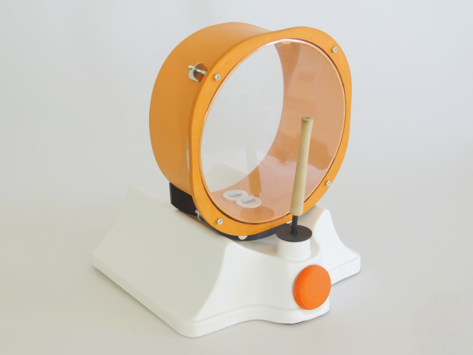 Барабан – это электро-механическое устройство с подвижной частью, предназначенное для занятий с детьми, позволяющее развивать слухоречевой аппарат. Состоит из основы, закрепленного на ней барабана, вращающейся барабанной палочки, кнопки активации электромотора, а также разъем 3,5 мм. Для подключения дополнительного девайса. На нижней части имеется батарейный отсек для четырех элементов питания. Барабан можно активировать при помощи стационарной кнопки расположенной на корпусе устройства, так и подключив через разъем дополнительную выносную кнопку активации. Занятия можно проводить как с одним ребенком, так и с группой детей под руководством педагога.