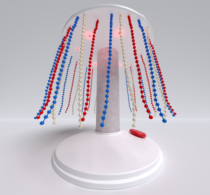 Включить игру просто: достаточно нажать на кнопку – и начнётся настоящее волшебство: основание завертится, увлекая блестящие цепочки за собой, заиграет музыка и весело засветятся огоньки. Имеется возможность подключения выносной кнопки.