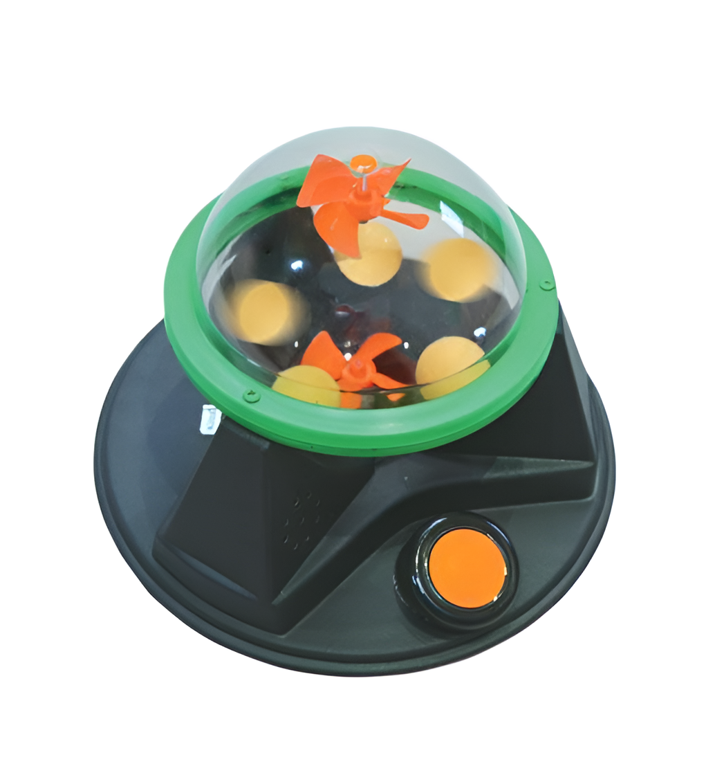 Чтобы три шарика для пинг-понга начали вращаться под пластиковым колпаком, нажмите на черно-оранжевую кнопку-переключатель или воспользуйтесь адаптированным внешним переключателем (не входит в комплект).