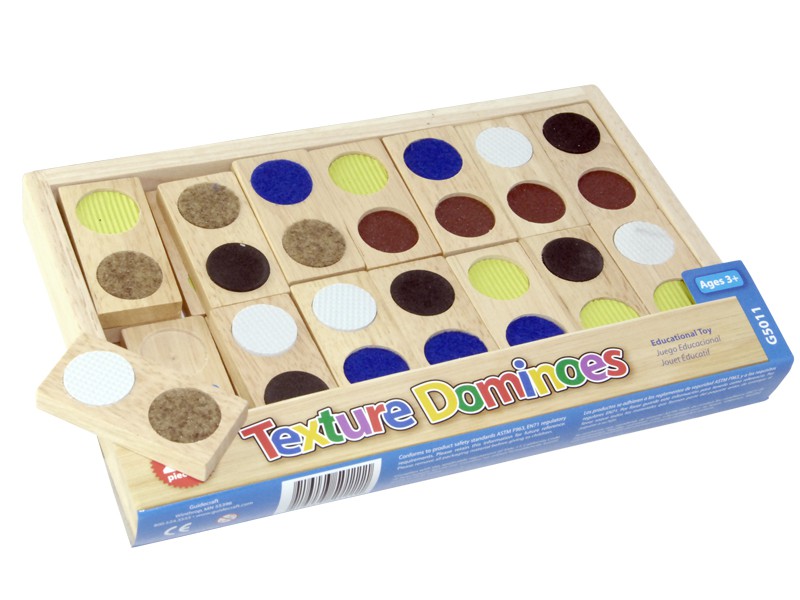 Домино состоит из 28 фишек, на поверхности которых варьируется комбинация из 7 различных текстур и цветов. Игра развивает тактильное восприятие и логическое мышление. Ребенок должен находить половинки карточек не с одинаковыми рисунками, а с похожими на ощупь поверхностями.