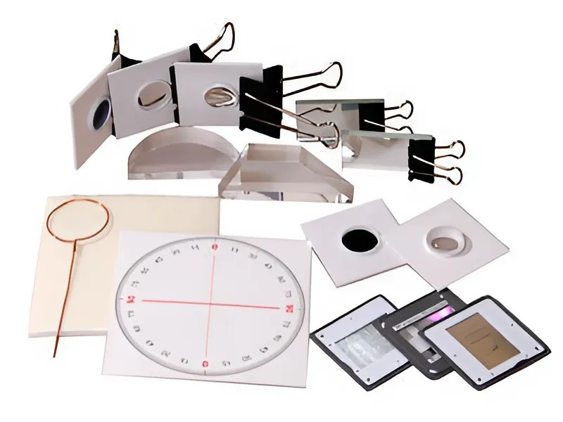 Экран с прорезью выполнен в виде пластмассовой коробки, в которую вложены оптические элементы. Для проведения лабораторных работ необходимы: источник постоянного напряжения на 4,5 В, ключ, соединительные провода, линейка, мыльный раствор, лист белой бумаги.