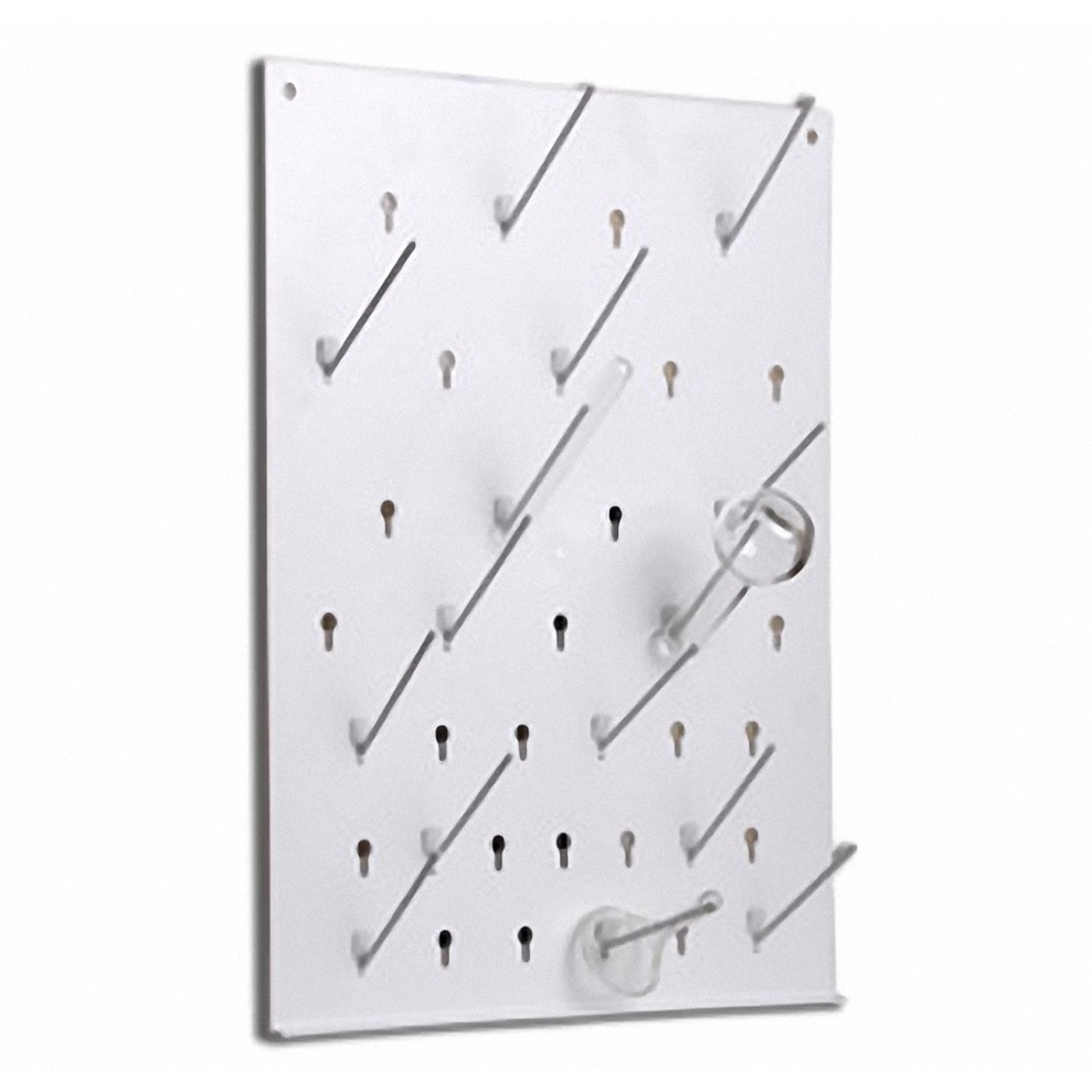 Доска представляет собой пластмассовую панель с 37 отверстиями, в которые вставляются пластиковые держатели для посуды (крючки). Для крепления на стене доска имеет два отверстия, также в комплекте предусмотрены шурупы, дюбели и запасные крючки.