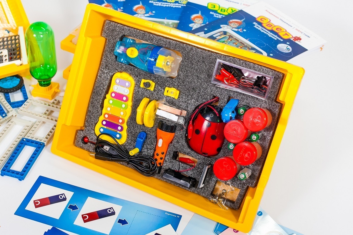 • Комплект № 1 «Естествознание. Экспериментирование». В комплект входят наглядно-дидактические материалы для индивидуальной и групповой работы с детьми дошкольного возраста: мультидатчик для изучения тем «Свет», «Температура», «Электричество», «Звук»; приложение для получения и обработки результатов с датчика, лабораторные приборы и оборудование для экспериментирования с магнитами, водой; «Обучающий планшет ДО», комплект карточек с заданиями по теме «Естествознание», видео-контент с обучающими роликами, журнал проекта.
