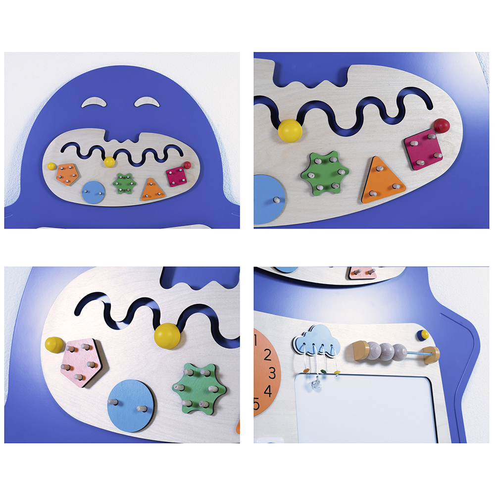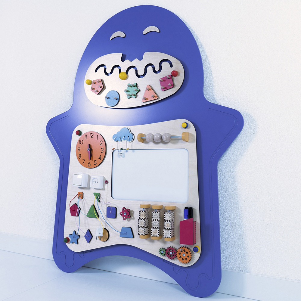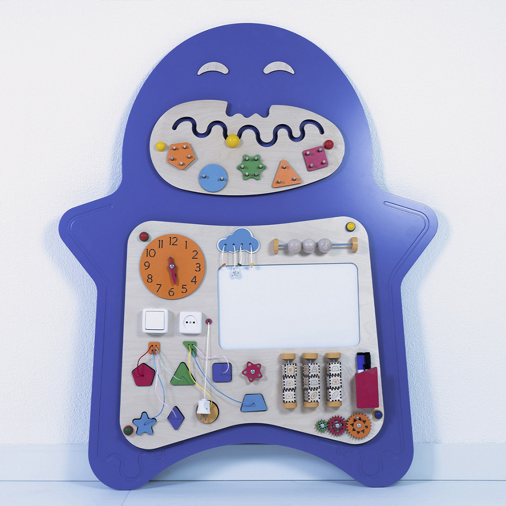 Развивающий сенсорный Бизиборд «Мип» украсит стену любого образовательного учреждения. Необычный внешний вид непременно привлечет внимание детей, а встроенные развивающие элементы займут их на долгое время.