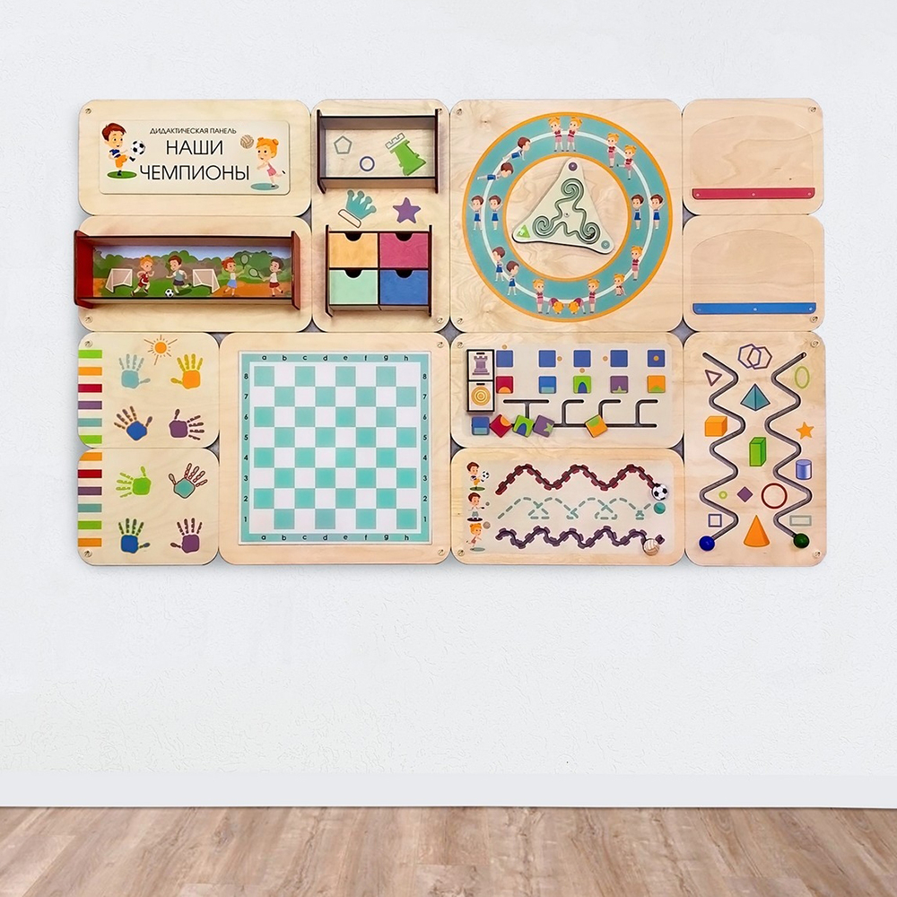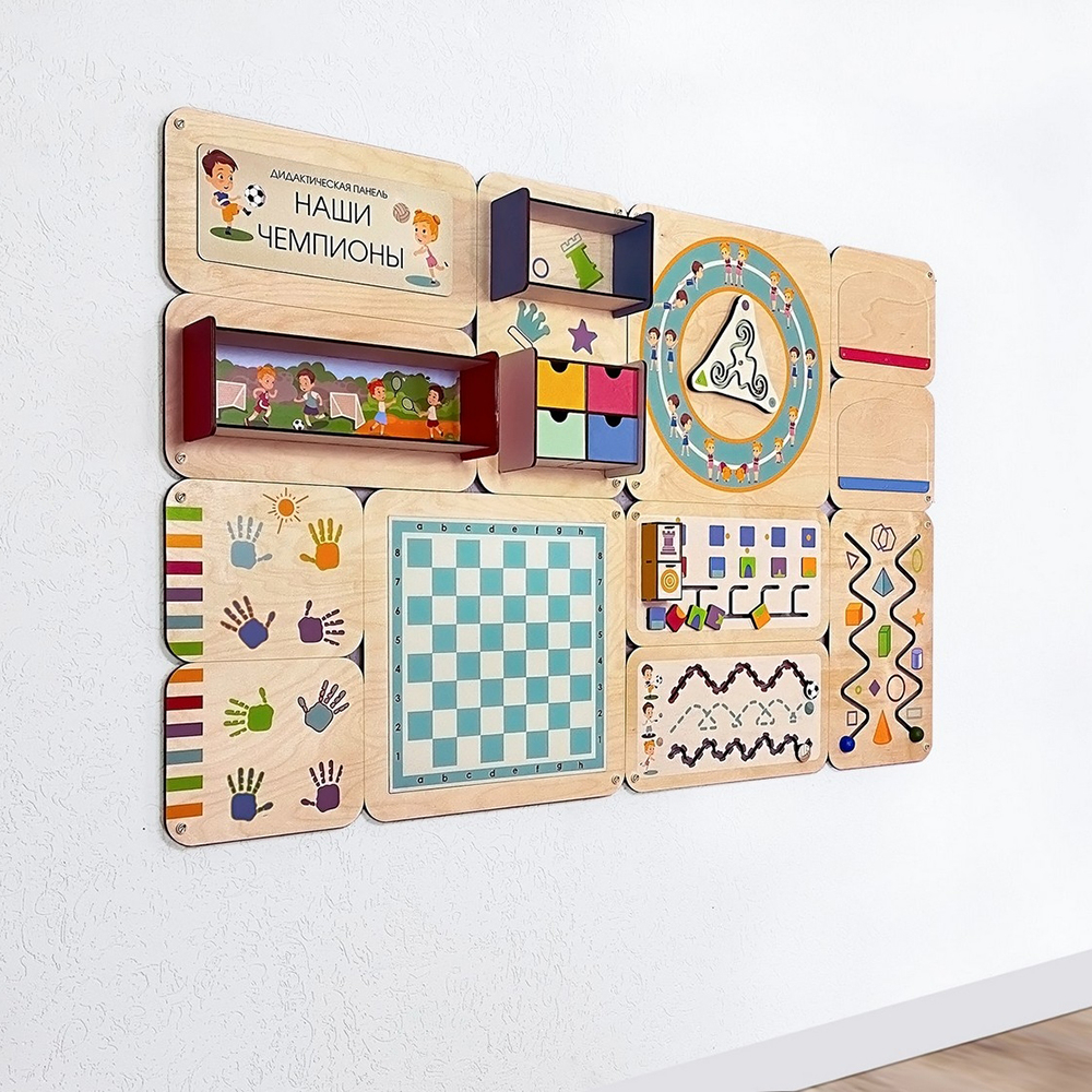 Дидактические панели отлично дополняю наборы цветных и иллюстрированных стеновых панелей, которые позволят оформить всё помещение в едином стиле.