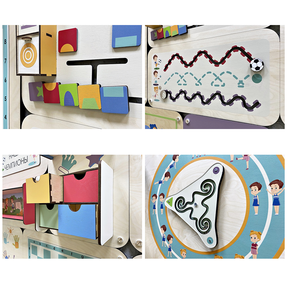 • Прочно закрепляются на стенах и не свалятся на детей, даже если они будут тянуть. Все материалы панелей безопасны для детей и сертифицированы. Малыши могут трогать, облизывать и грызть деревянные детали – их здоровью ничего не угрожает.