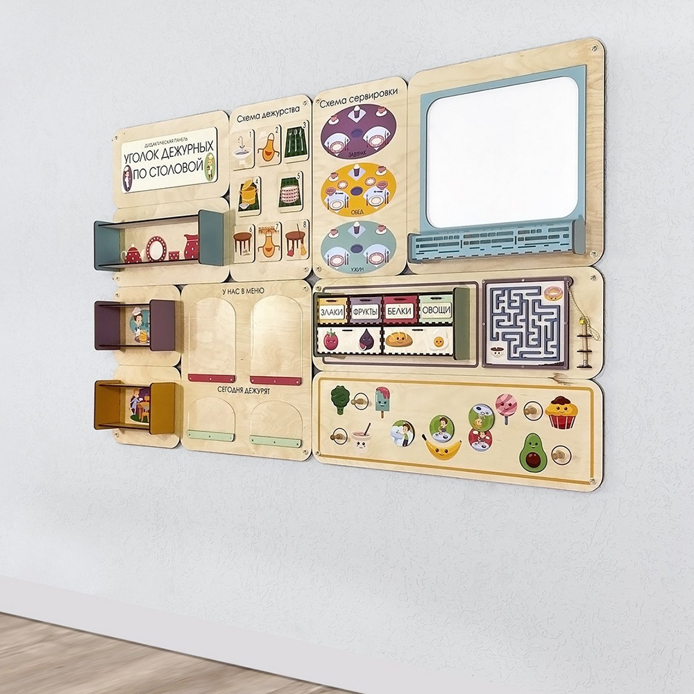 - Занятия с панелью «Уголок дежурных по столовой» нацелены познакомить детей с меню питания, графиком дежурств, полезными продуктами, правильным поведением за столом. Дети приобщаются к посильной работе, учатся заботиться о коллективе.