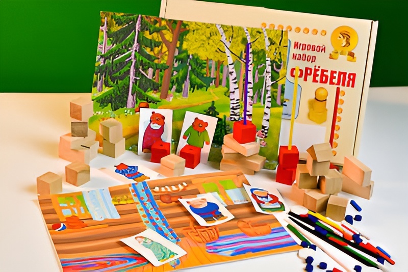 Набор разработан в соответствии с педагогическими принципами Фребель-педагогики и представляет собой специально составленные комплекты из элементов «Даров Фребеля» с авторскими иллюстрациями по мотивам сказок русских писателей. Карточки изготовлены из мелованной бумаги, ламинированной пленкой. Печать полноцветная. Элементы для игры изготовлены из дерева и пластика и упакованы в зип-пакеты.​