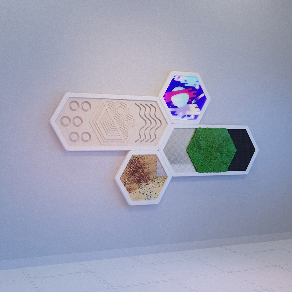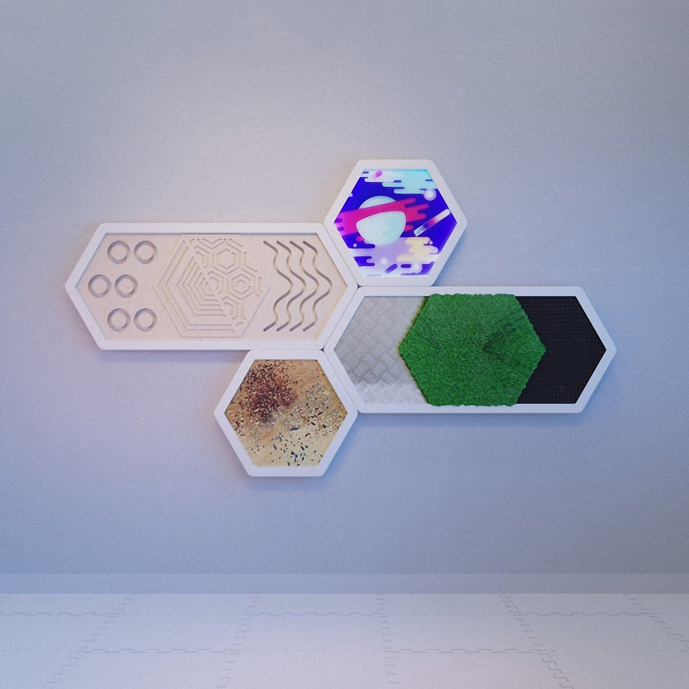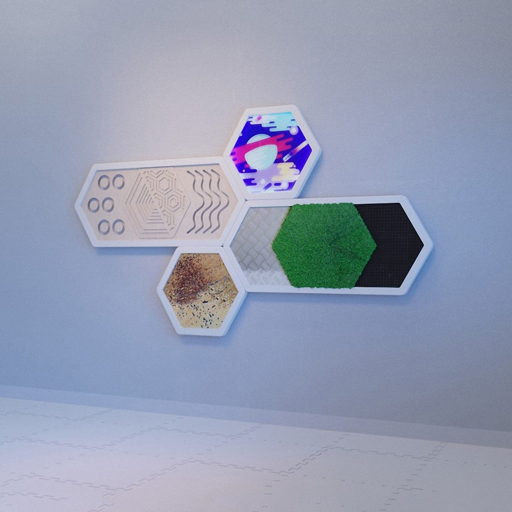 Состоит из четырёх шестигранных панелей, покрытых различными материалами: ворс, пайетки, дерево, металл, акриловый пластик, зеркало, натуральный камень. Благодаря различным фактурам, рельефам, звукам и температурным ощущениям ребёнок приобретает новый тактильный опыт, учится классифицировать материалы по отдельным категориям и сравнивать их свойства. Это хорошо отражается на развитии малышей, ведь чем разнообразнее палитра тактильных ощущений, тем лучше развивается мозг, в частности, зоны, отвечающие за анализ информации и развитие речи.