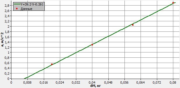 — Построению зависимостей ускорения от массы перегрузка, построение прямых линий, наилучшим образом аппроксимирующих экспериментальные зависимости и определение угловых коэффициентов и свободных членов построенных прямых