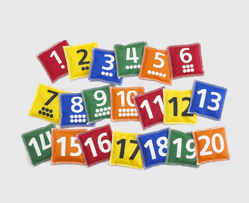 Эти разноцветные мешочки помогут в игровой форме дать и закрепить знания о цифрах (на мешочках от 1 до 10 есть цифра и равное этой цифре количество точек, чтобы их можно было посчитать, на остальных 11-20 точек нет, только цифра).
