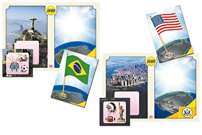 На карточках для правой части игрового поля изображены флаги и часть карты мира, они служат продолжением изображений на игровых полях и содержат общие с ним детали фона. На карточках для левой части игрового поля дана врезка, на которой представлены предметы, являющиеся как бы «визитной карточкой» данной страны. Контуры врезки (вырезанные уголки) служат подсказкой.​