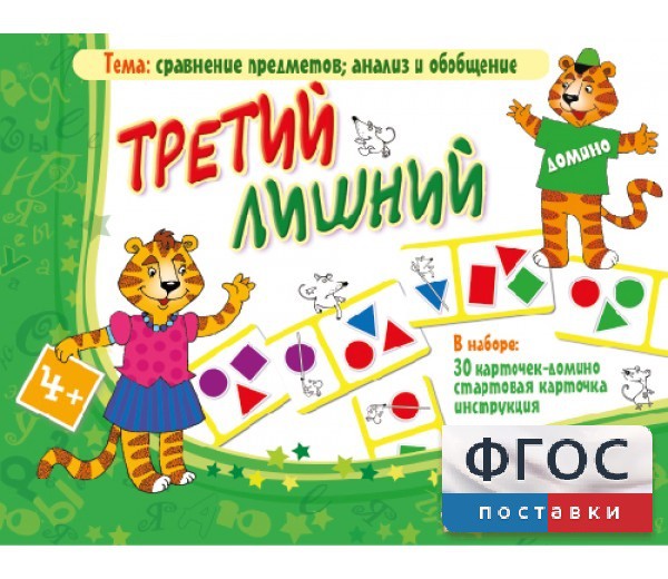 В игре для задачи «исключение предметов» подобраны геометрические фигуры. В каждой группе из трёх фигурок можно найти одну из них, отличающуюся от остальных по цвету, и одну – по форме.