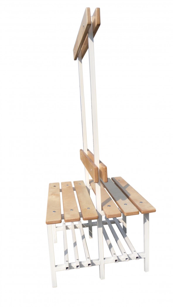 Состоит из металлического каркаса и зеркально расположенных сидений, спинок и вешалок. На ножки устанавливаются пластиковые заглушки. Имеются полки для обуви.