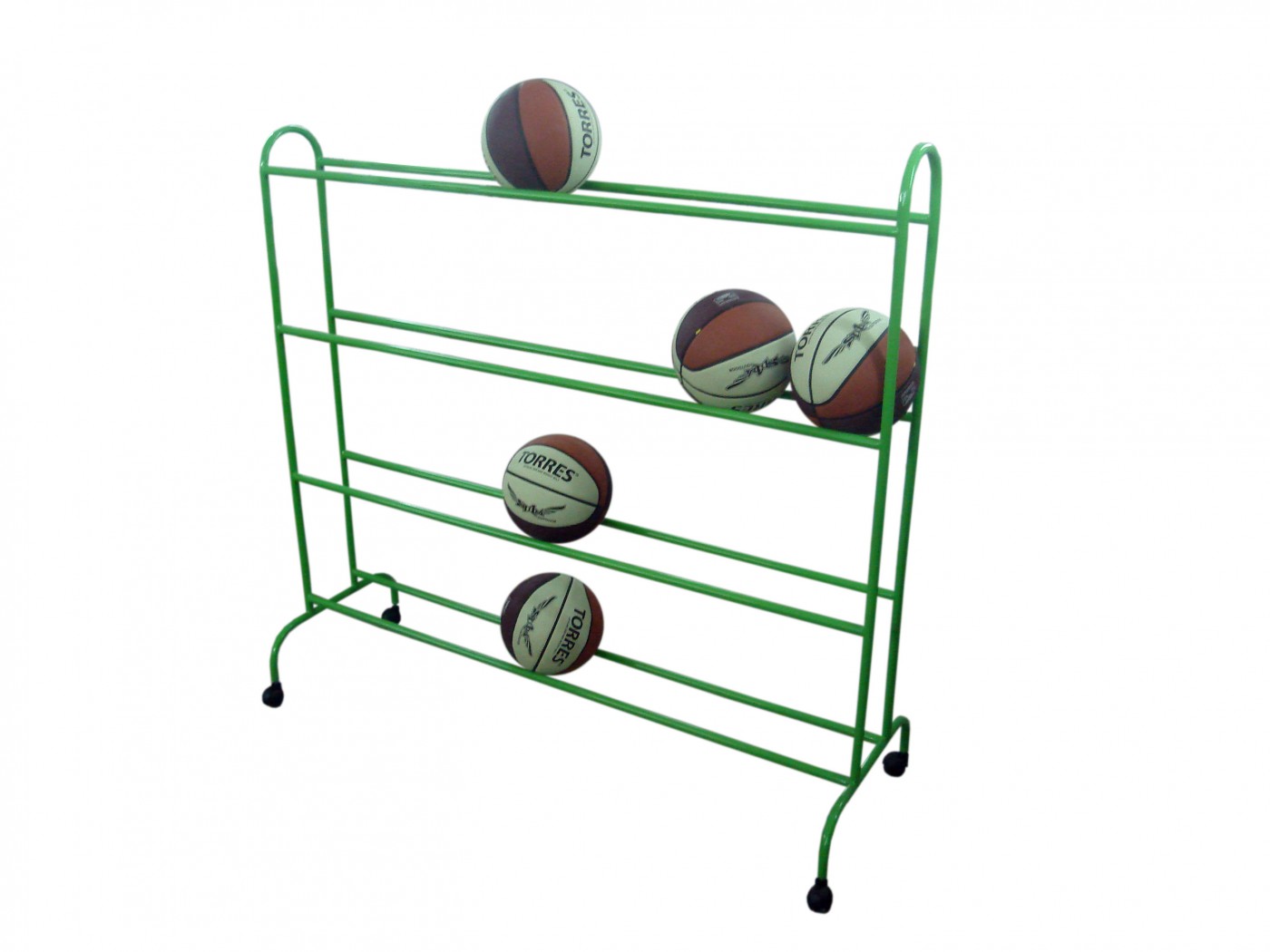 Стеллаж цельносварной, 4 металлических полки. Полки расположены под наклоном для устойчивой фиксации мячей и для избежания их перекатывания по полкам.