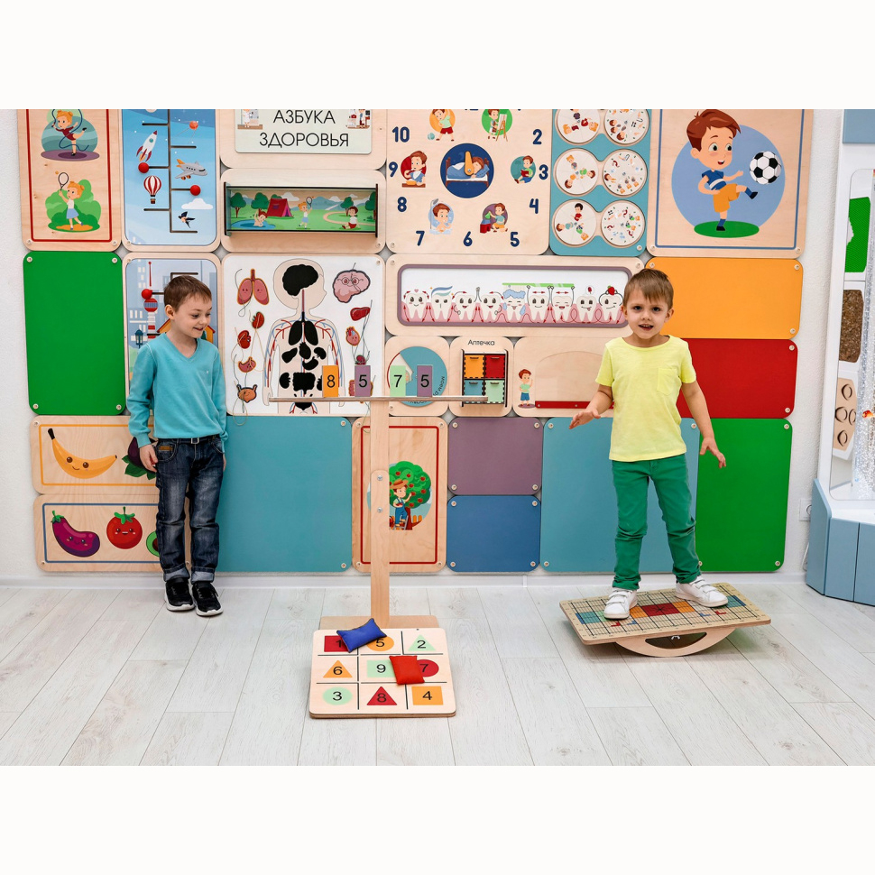 Балансир изготовлен из прочной экологичной фанеры, не имеет острых углов, о которые можно травмироваться. Изделие хорошо отшлифовано и покрыто огнезащитным лаком, стойким к загрязнениям и истиранию. В комплекте идёт набор дополнительного инвентаря для занятий, методическое пособие и универсальный ключ для поворота полозьев.