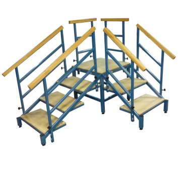 Лестница для обучения ходьбе состоит из платформы, двух съемных лестничных блоков, которые монтируются к платформе как прямо, так и под углом 90 градусов. Блоки отличаются количеством лесенок (2 и 3) и расстоянием между лесенками (высотой ступенек). Лестничные блоки и платформа снабжены поручнями с обеих сторон. Поручни регулируются по высоте.