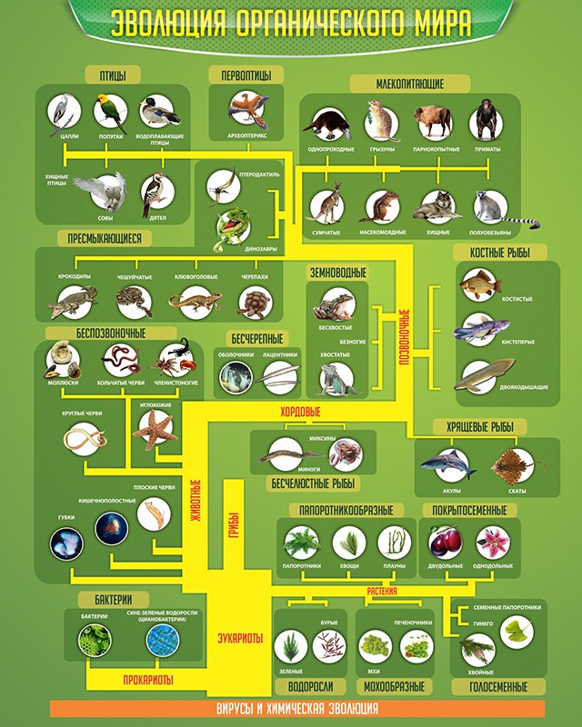 Настенный школьный стенд «ЭВОЛЮЦИЯ ОРГАНИЧЕСКОГО МИРА» в доступный и понятный схематичный способ расскажет Вашим детям о многообразии органического мира: птицы и первоптицы, млекопитающие и пресмыкающиеся, земноводные и рыбы (костные и хрящевые), беспозвоночные и хордовые. А также эукариоты, водоросли, растения все основные понятия темы «Органический мир» в компактном порядке расположены на представленной схеме.
