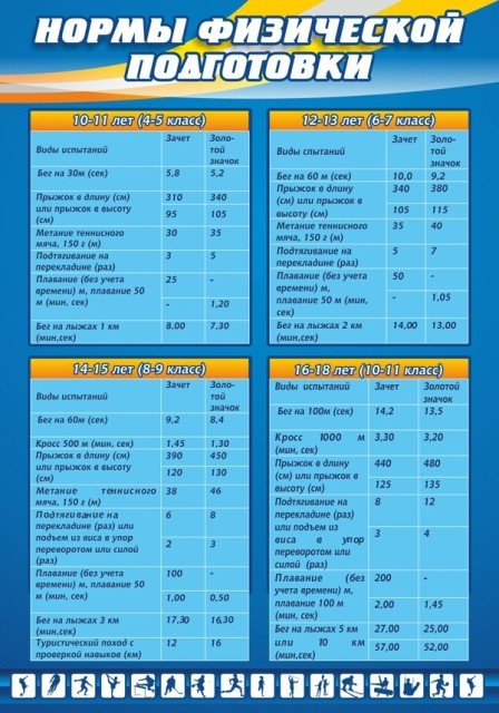 В каждом виде спорта есть какие-то нормативы, к которым надо стремится и побороть их. Учителя должны всегда информировать школьников о таких нормах, вырабатывая в них стремления к победе. Стенд «Нормы физической подготовки» был разработан для того, чтобы руководители могли показать все нормы во всех видах спорта по возрастным категориям разделенным на группы, придавая ребенку больше стимула для их покорения. Стенд изготовлен из качественного ПВХ, защищенный ламинацией, которая увеличивает его срок службы. Монтаж можно осуществить на поверхность стены с помощью двухстороннего скотча.