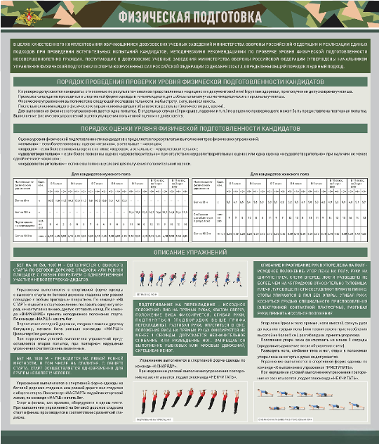 Стенд представляет собой информационную панель, на которой размещены основные нормативы физической подготовки. Стенд предназначен для наглядного отображения нормативных данных по физической подготовке учащихся или курсантов, а также условий, которые необходимо соблюдать при выполнении упражнений.