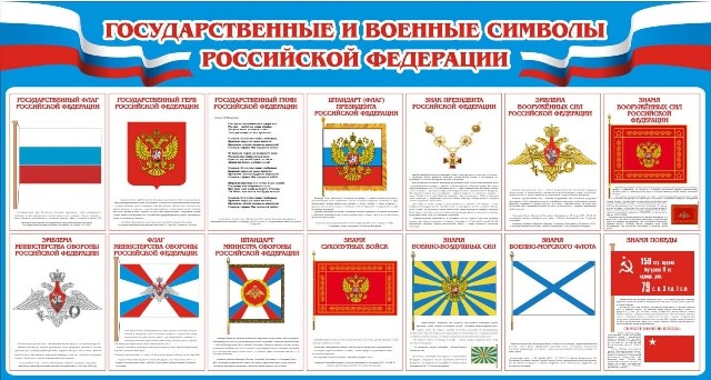На стенде «Государственные и военные символы РФ» предоставлена ознакомительная информация о российской символике и знаках государственного герба. Стенд позволяет ознакомится ученикам и курсантам различных военных заведений с историей происхождения государственных гербов и символов РФ, а также к каким учреждениям относятся и где используются. Стенд был сделан из прочного материала пластика, благодаря чему стенд можно назвать легким и надежным. Визуальная картинка с символами РФ имеет высокое разрешение, покрытое сверху защитной ламинацией. Стенд крепится любыми способами в зависимости от того, какая поверхность стены в здании.