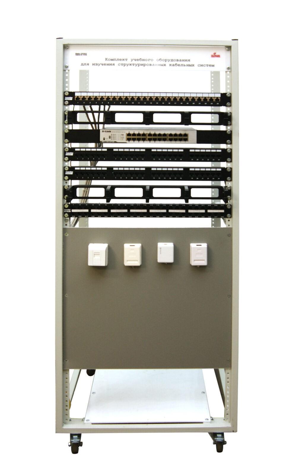 Комплект учебного оборудования предназначен для изучения структурированных кабельных систем и представляет монтажную стойку с установленными сетевым оборудованием и панелью с сетевыми розетками различного вида и категорий.