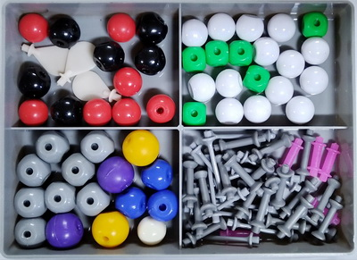 В набор входят 175 пластмассовых шаров разного цвета и диаметра (имитация атомов). На них имеются отверстия для соединительных стержней разных видов по длинне:125 металлических (для одинарных связей) и 10 металлических гибких (для моделирования двойных и тройных связей). Шары  и стержни разложены по пакетам и уложены в пластмассовый футляр на котором наклеена этикетка с маркировкой.