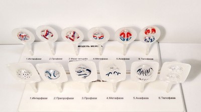 В комплект модели входят 2 подставки с гнездами для вставляющихся в них моделей клетки на разных стадиях деления. Одна часть моделей клеток (6шт.) предназначена для демонстрации митоза. Высота модели не менее 14 см.