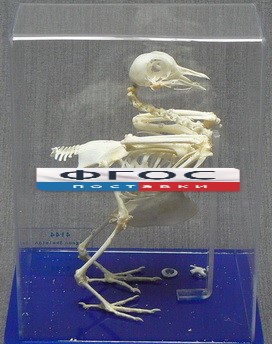 Остеологическая модель представляет собой скелет голубя, смонтированный с сохранением естественного положения тела животного и защищенный от механических повреждений прозрачным пластиковым колпаком.