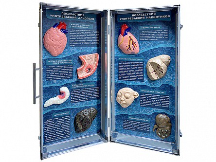 Учебно-демонстрационное пособие представляет собой раскладной кейс с двумя раздельными панно, на которых размещены модели внутренних органов человека, имитирующие последствия употребления алкоголя и наркотических веществ.